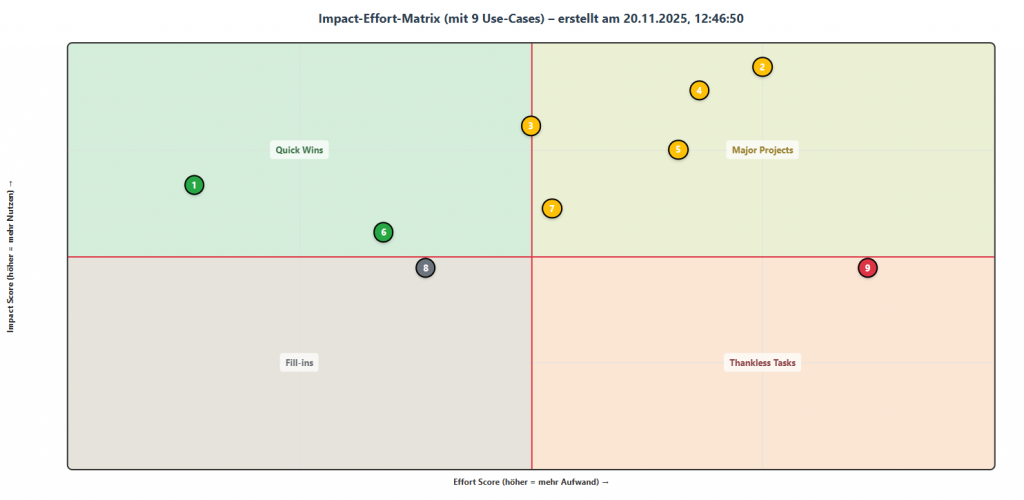 Der Ausgangspunkt jeder erfolgreichen KI-Initiative sollte ein präzises Verständnis der eigenen Potenziale und Prioritäten sein. In professionell moderierten Workshops werden interne Prozesse, Datenquellen und Problembereiche strukturiert analysiert. Ziel ist es, sogenannte „niedrig hängende Früchte“ zu identifizieren: also Use Cases mit hohem Nutzen, geringem Reifegradbedarf und schneller Umsetzbarkeit.