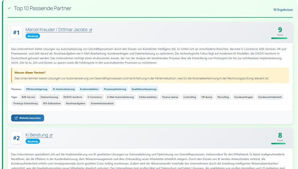 Dazu gehören unter anderem ein KI-gestütztes KI-Readiness-Assessment, Tools zur Definition und Verbesserung von KI-Use-Cases, die größte Datenbank für KI-Use-Cases in Deutschland sowie eine KI-gestützte Suche nach passenden Umsetzungspartnern für neu entwickelte oder weiter verbesserte Use Cases. Ergänzt wird die Toolsuite durch Funktionen, die Mitarbeiter im Veränderungsprozess gezielt einbinden und überzeugen, sowie durch ein Projektmanagement-Tool, das die Einführung verbindlich strukturiert und wirksam unterstützt.