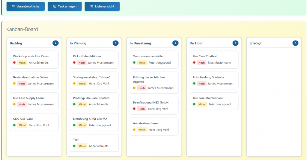 Die aus der Potenzialanalyse hervorgehenden Anwendungsfälle werden in einer iterativen Roadmap priorisiert und umgesetzt. Der Fokus liegt auf praxisnahen Piloten, die rasch Ergebnisse liefern, aber skalierbar sind. Erfolgreiche Projekte dienen als Referenz und motivieren zur Ausweitung auf andere Bereiche.