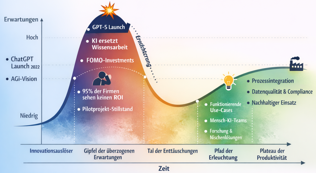 In meiner Beratungspraxis sehe ich regelmäßig dasselbe Muster: Ein Unternehmen stellt ChatGPT-Lizenzen bereit, lässt eine Schulung durchführen und wartet auf Ergebnisse. Die bleiben aus – oder beschränken sich auf individuelle Anwendungsfälle ohne systemischen Effekt. Das ist kein Misserfolg des Unternehmens, sondern ein Missverständnis darüber, was KI-Adoption erfordert.